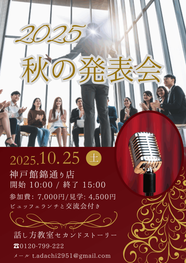 セカンドストーリーでは、名古屋市を中心としたエリアにて簡潔な説明や印象深いスピーチができるようになるための「話し方」に特化したスクールを開催しております。人前でうまく話せないという方や、あがり症で心配だという方でも自信をもって人前で話せるようになるために必要なスキルを1から10まで全てお教えいたします。そしてさらに、対面での会話力アップと最高に盛り上がったスピーチにするための聞き手の方達とのトーク術も織り交ぜたレッスンも開催しております!